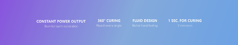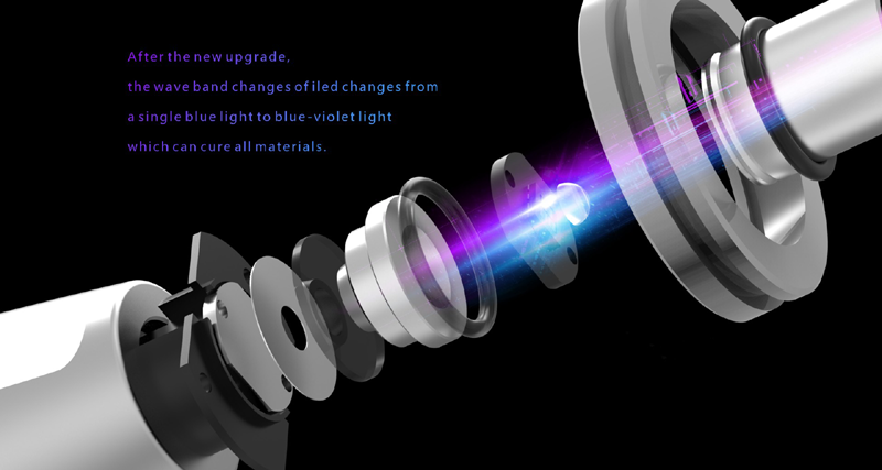 - Enestående hastighet og kraft. Den enorme kraften fra utsendt lys 2300 mW / cm2 tillater herding av 2 mm materiale på bare ett sekund.
