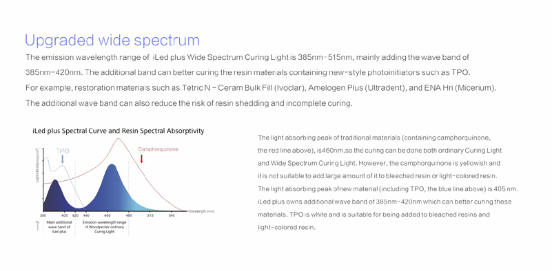 Ny effektiv polymerisasjonslampe fra Woodpecker. Det installerte batteriet har en høy kapasitet som tillater lang drift uten å lade opp. Jobber effektivt der tid er viktig.